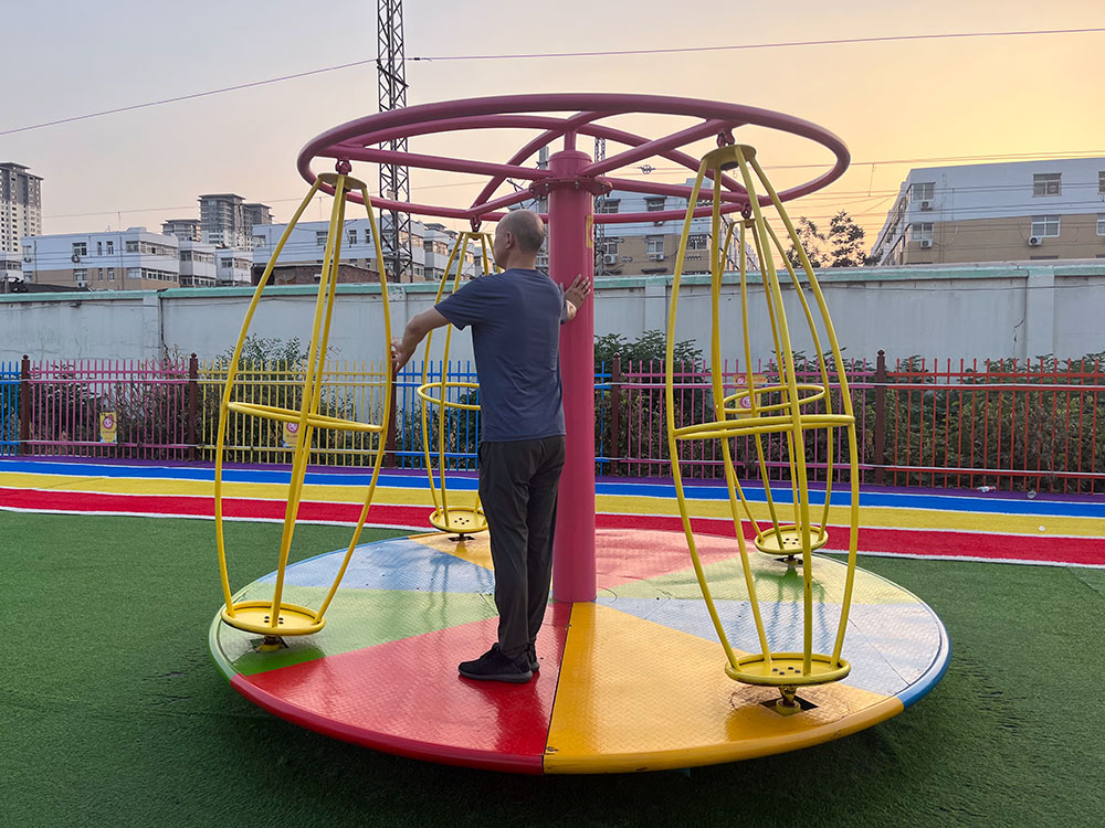 我公司生產(chǎn)的旋轉(zhuǎn)太空人是一款小成本趣味性強的無動力游樂設施,直徑3米,裝備4個太空艙,游客進去就能體驗失重離心的感覺,還有彈簧板,攀巖繩等設施,推動底盤就能自動旋轉(zhuǎn),大人小孩都能玩。