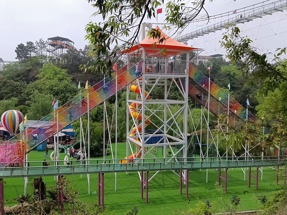 勇攀高峰是樂園的標志性設(shè)備,由攀爬網(wǎng)和和滑滑梯組成,中間安裝玻璃站臺,可以根據(jù)預(yù)算選擇高度和寬度,還可以和玻璃棧道結(jié)合做成樂園的地標性游樂項目。是大型親子游樂園的必備項目。